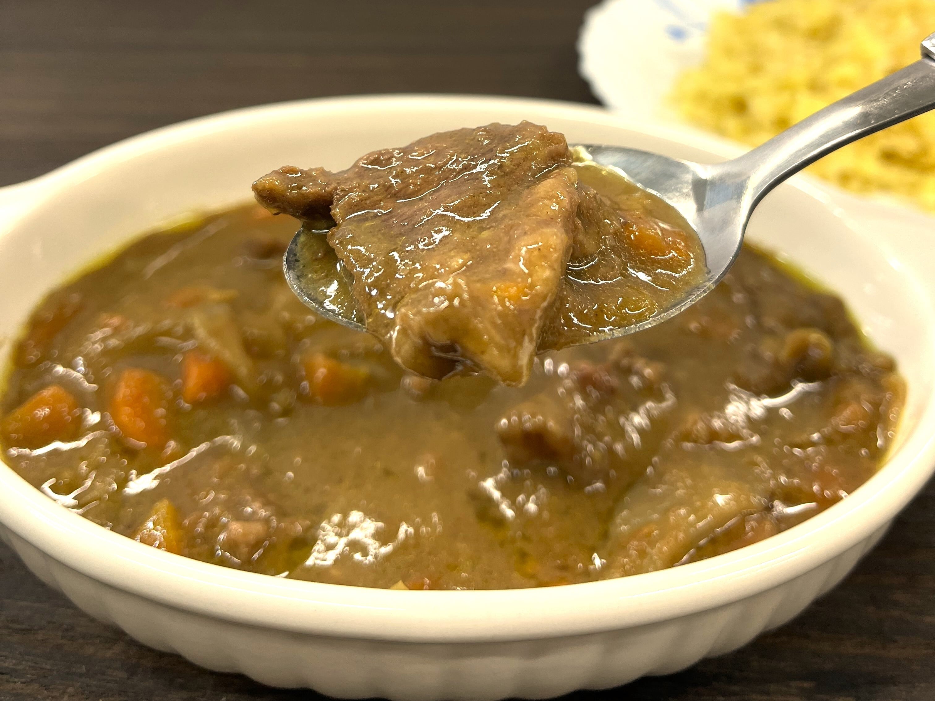 大きなお肉と野菜がたっぷりのりんご和牛の牛すじカレーをご紹介します。このカレーは、レトルト食品ながら、贅沢なお肉と野菜を使用しています。抗生物質を使用せず、りんごを食べて育った健康的な和牛を厳選しました。噛むたびにジューシーな肉汁とりんごの風味が広がります。すじ肉はやわらかく煮込んでいますが、クセになる食感とうま味をお楽しみください。